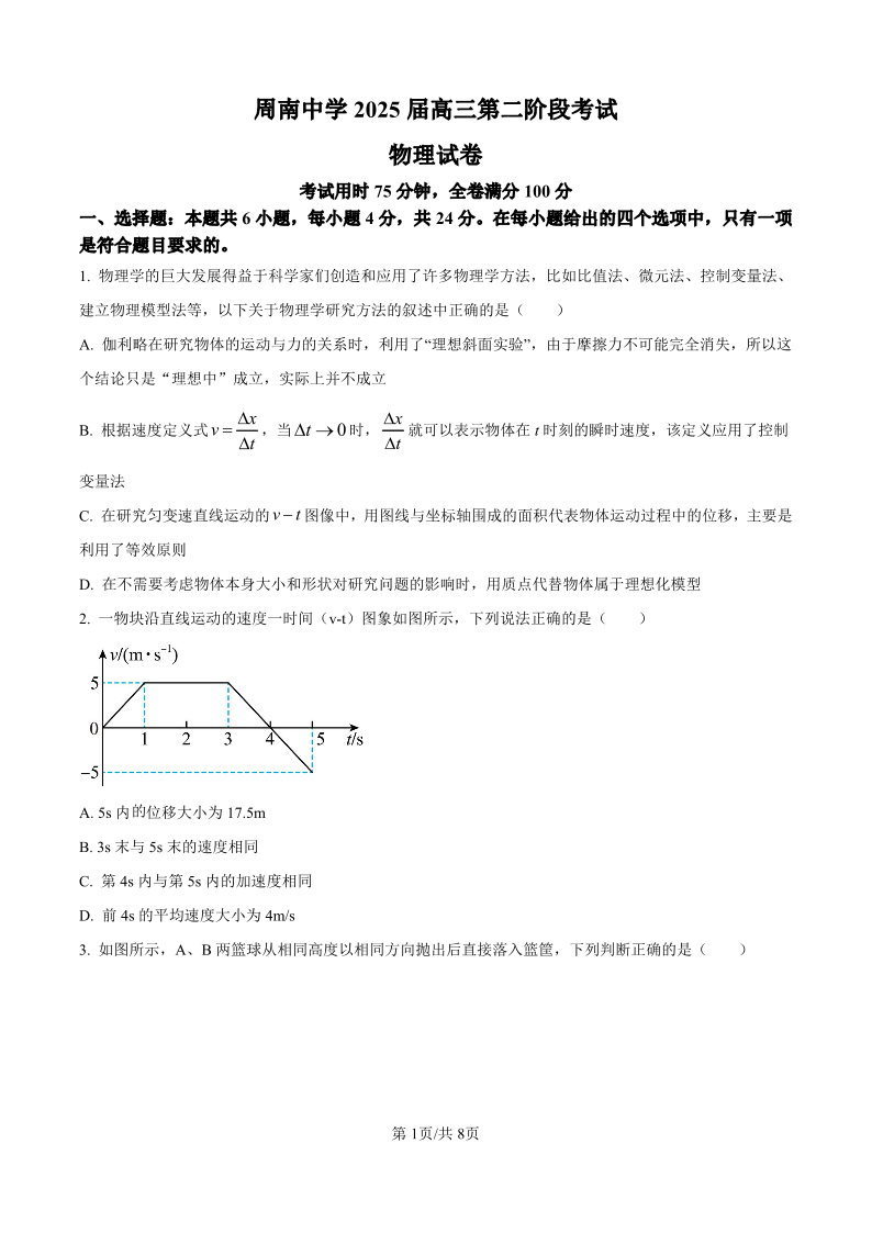 湖南省长沙市周南中学2025届高三上学期第二阶段考试 物理