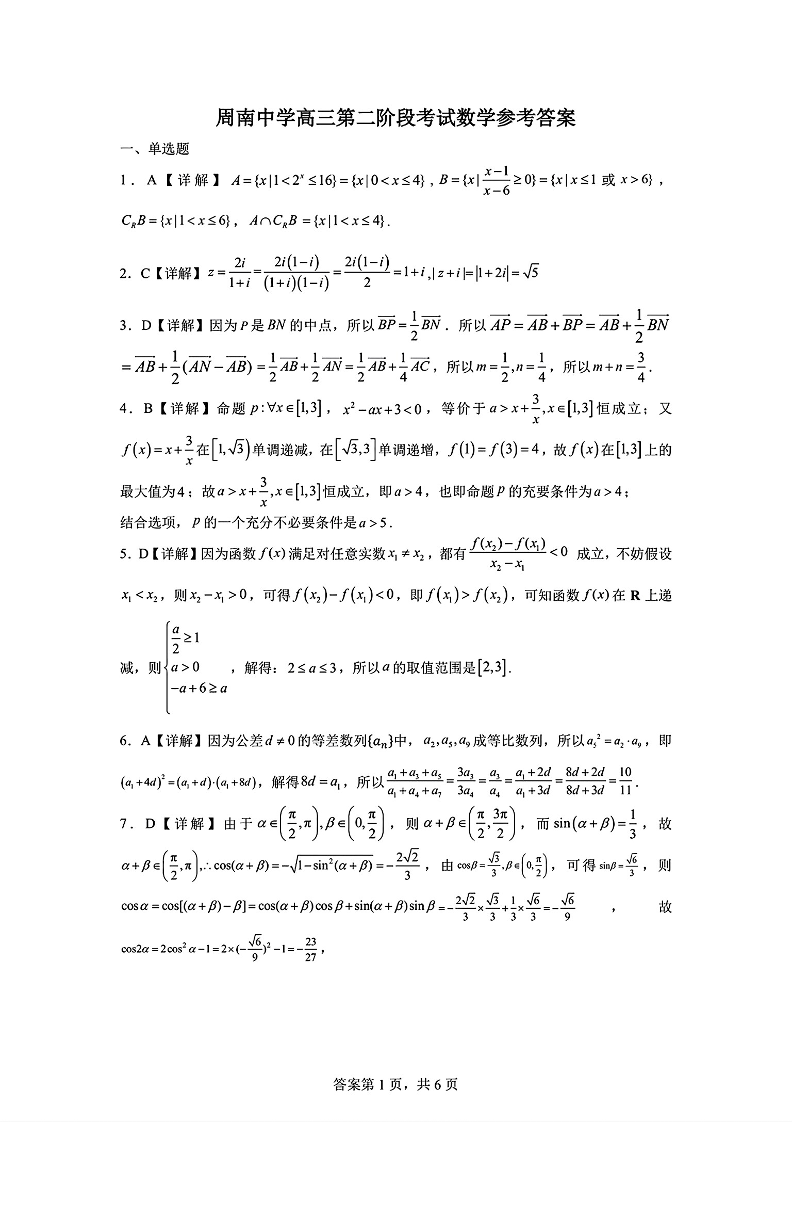 湖南省长沙市周南中学2025届高三上学期第二阶段考试 数学答案
