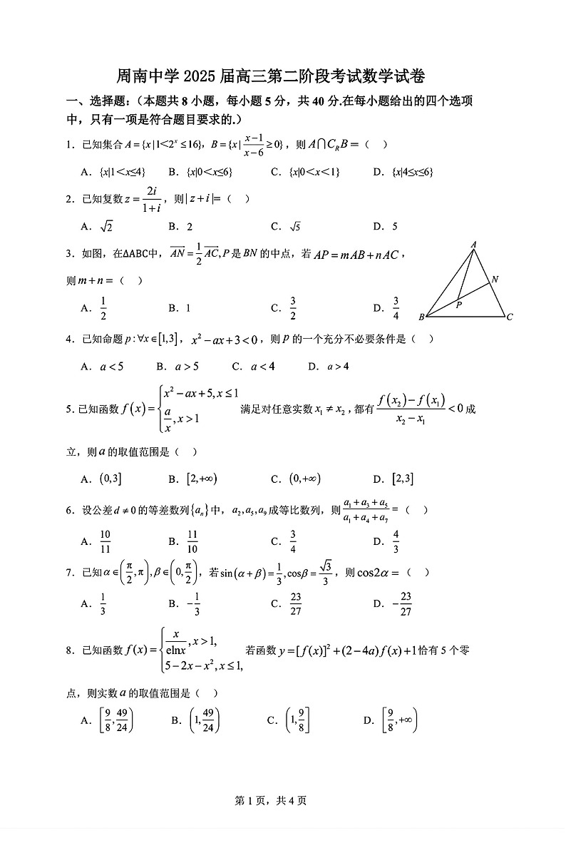 湖南省长沙市周南中学2025届高三上学期第二阶段考试 数学
