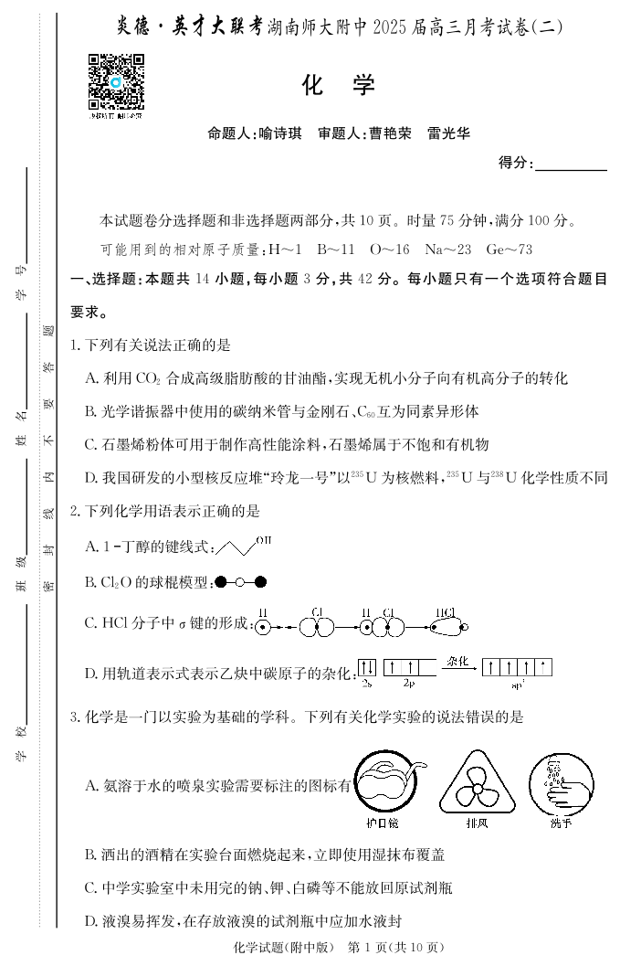 湖南师大附中2025届高三月考试卷(二) 化学