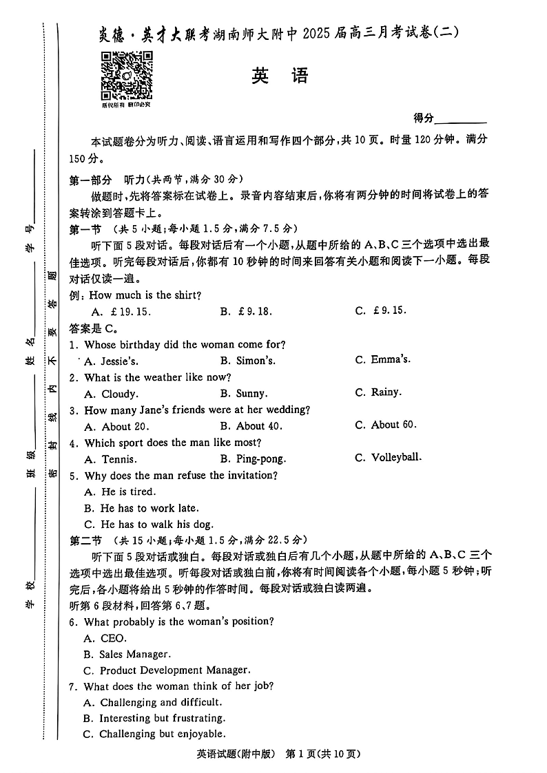 湖南师大附中2025届高三月考试卷(二) 英语