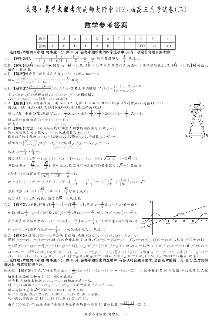 湖南师大附中2025届高三月考试卷(二) 数学答案