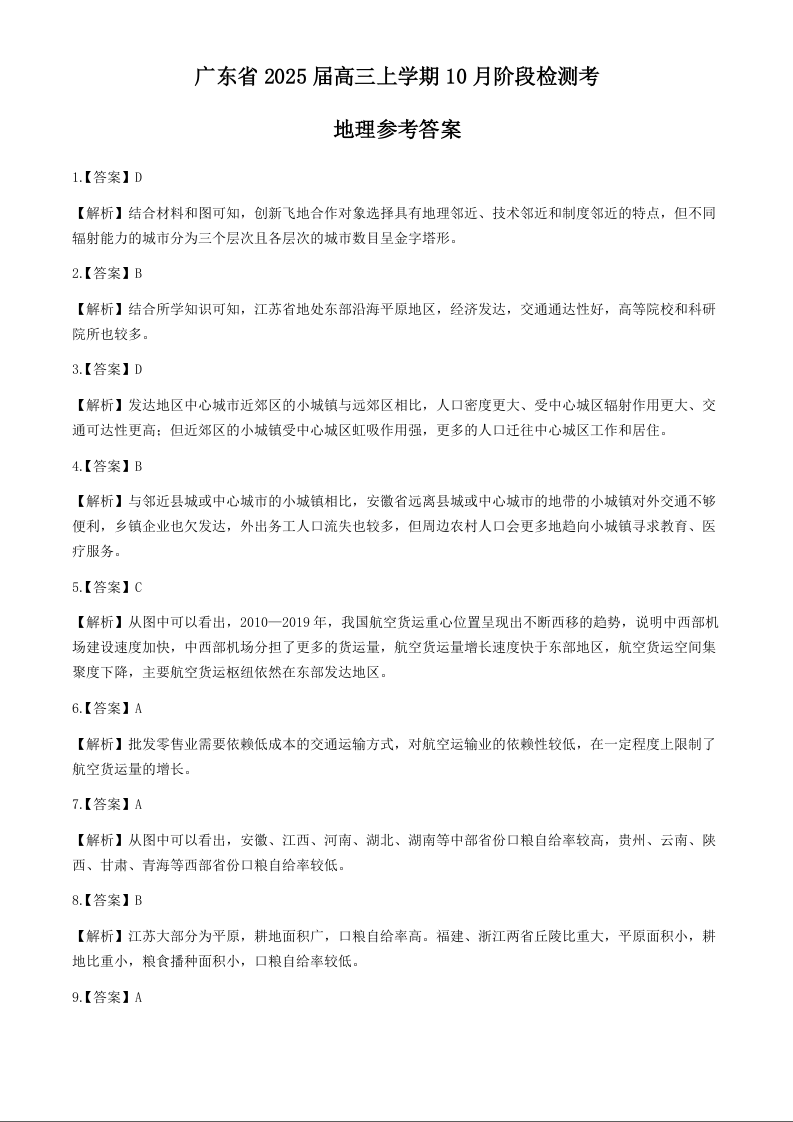 广东省2025届高三上学期10月阶段检测考 地理答案