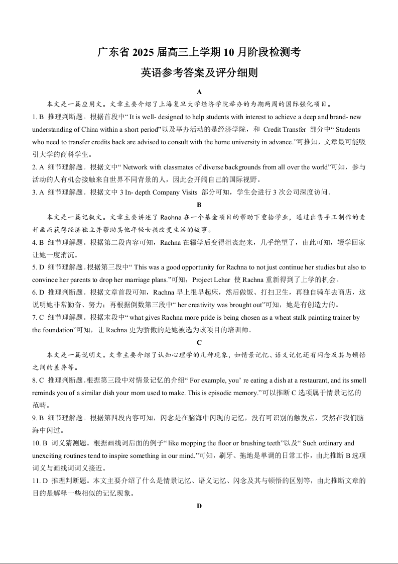 广东省2025届高三上学期10月阶段检测考 英语答案