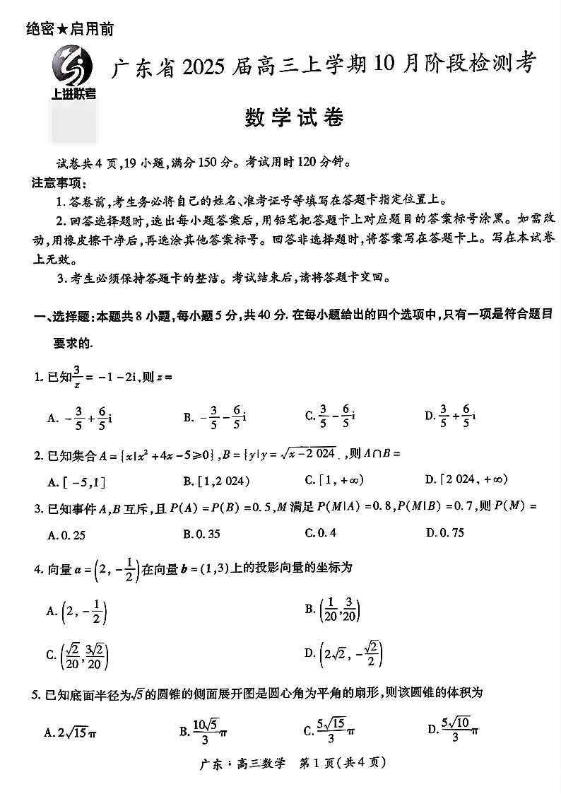 广东省2025届高三上学期10月阶段检测考 数学