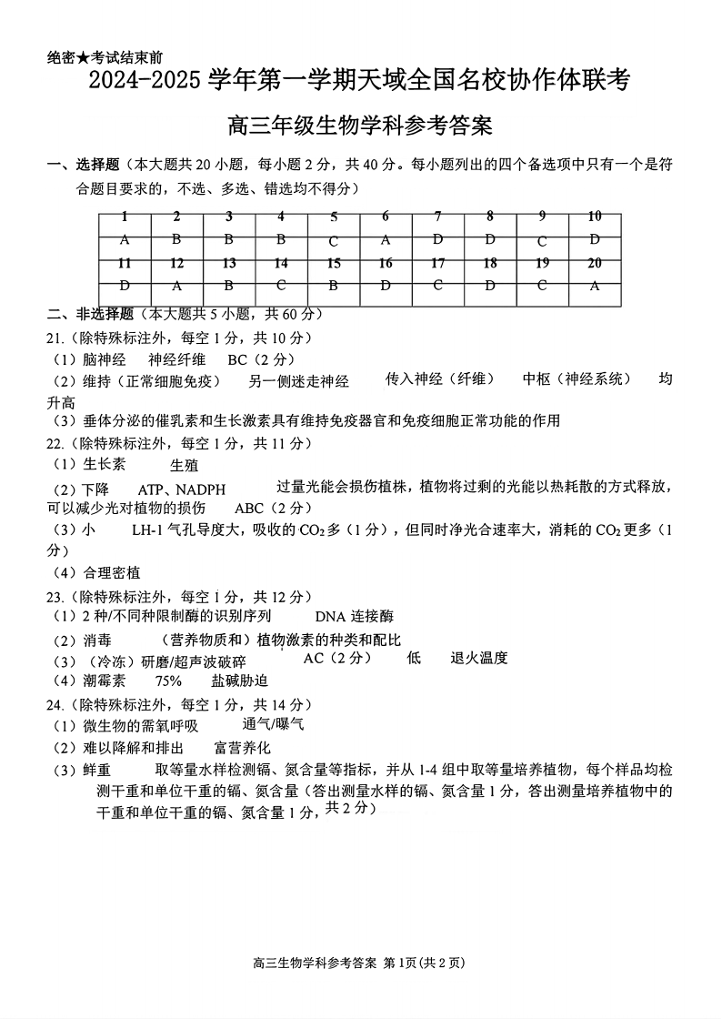 2024-2025学年第一学期天域全国名校协作体高三联考 生物答案