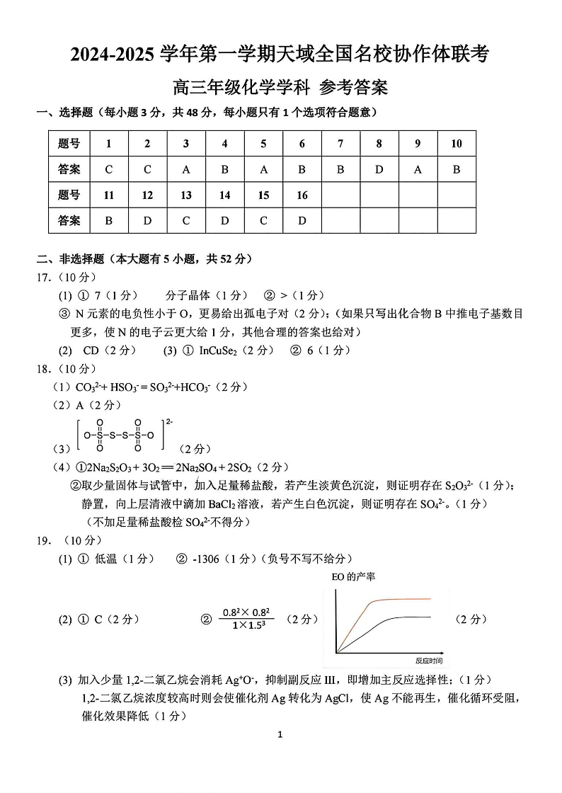 2024-2025学年第一学期天域全国名校协作体高三联考 化学答案