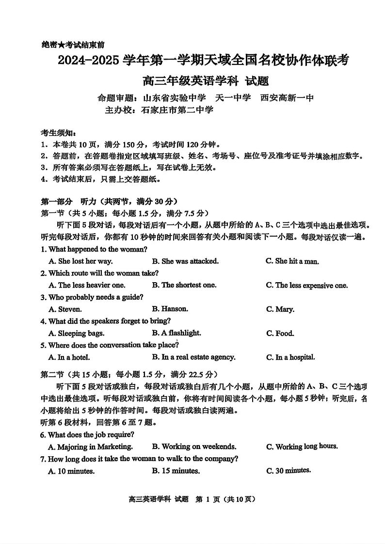 2024-2025学年第一学期天域全国名校协作体高三联考 英语