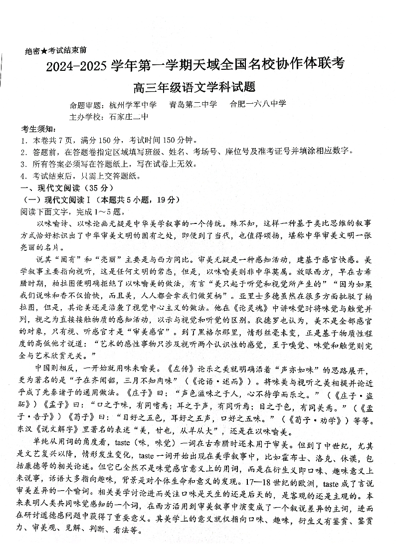 2024-2025学年第一学期天域全国名校协作体高三联考 语文
