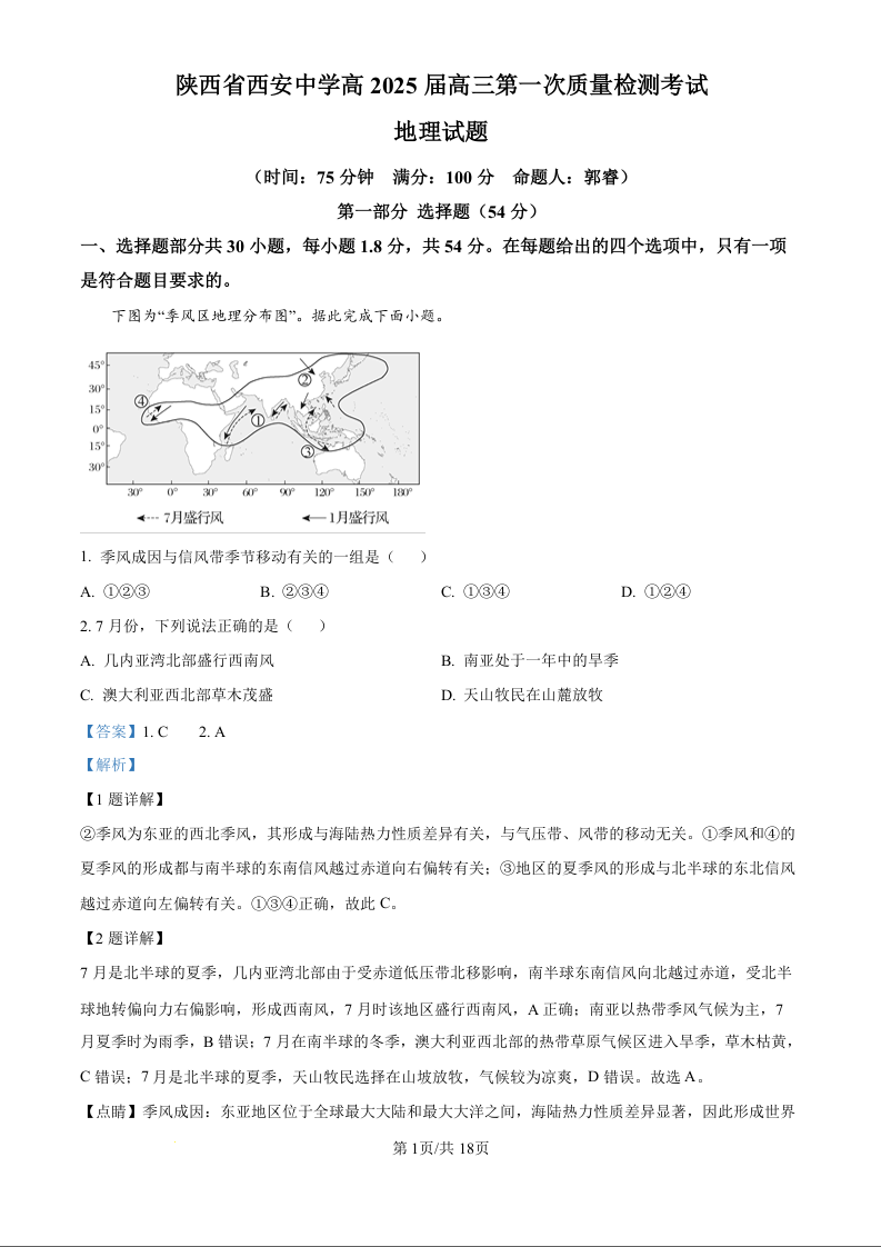 陕西省西安中学高2025届高三第一次质量检测考试 地理答案