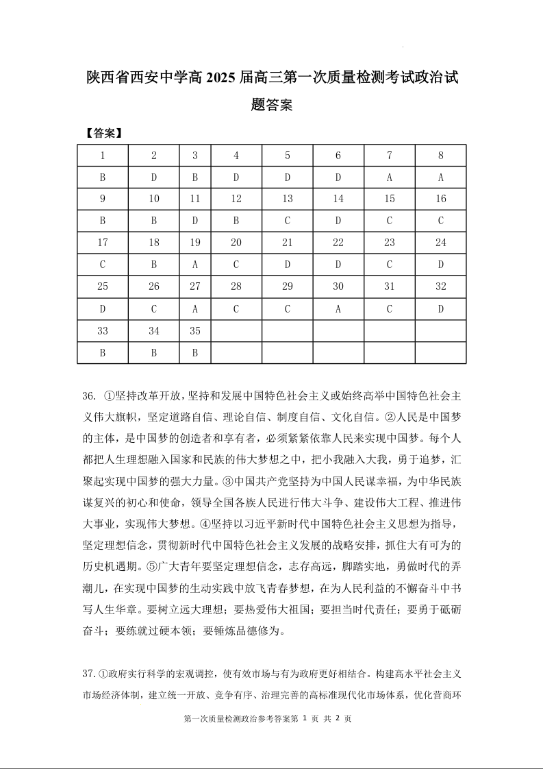 陕西省西安中学高2025届高三第一次质量检测考试 政治答案