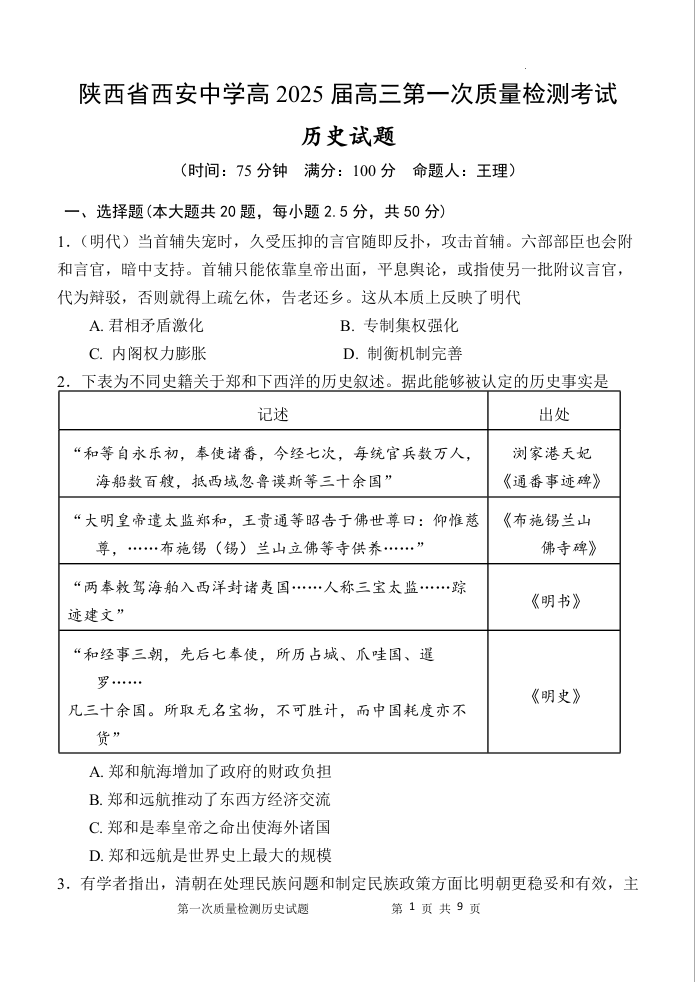 陕西省西安中学高2025届高三第一次质量检测考试 历史