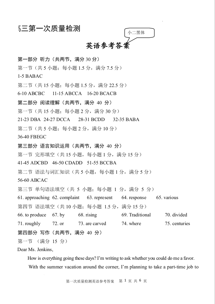 陕西省西安中学高2025届高三第一次质量检测考试 英语答案