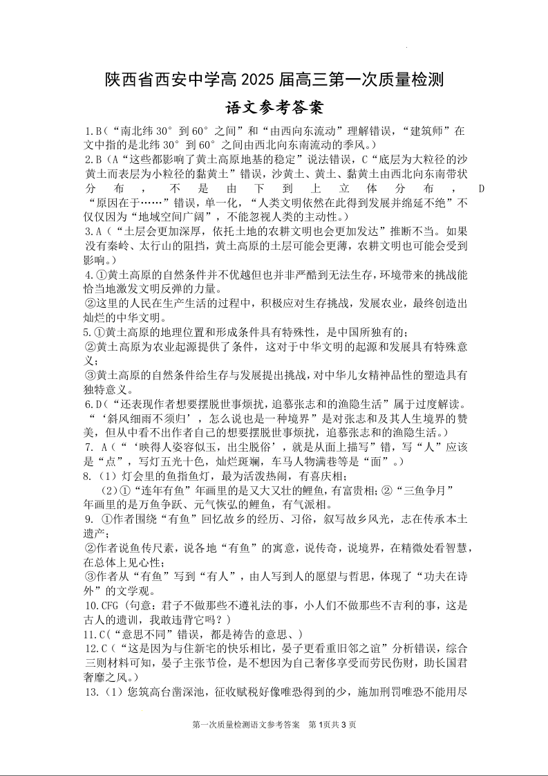 陕西省西安中学高2025届高三第一次质量检测考试 语文答案