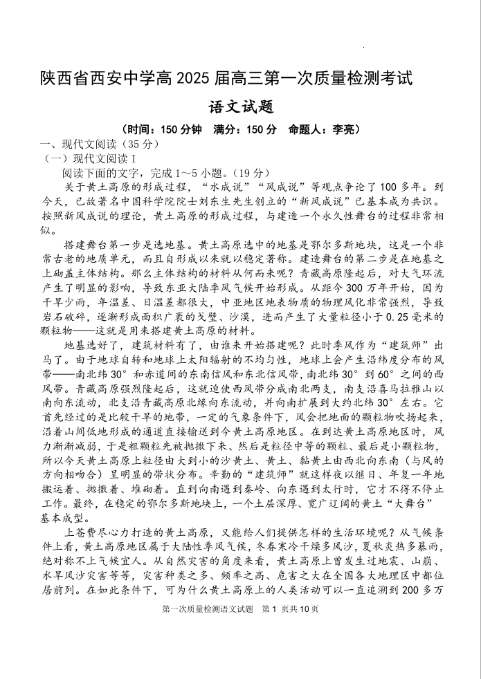 陕西省西安中学高2025届高三第一次质量检测考试 语文
