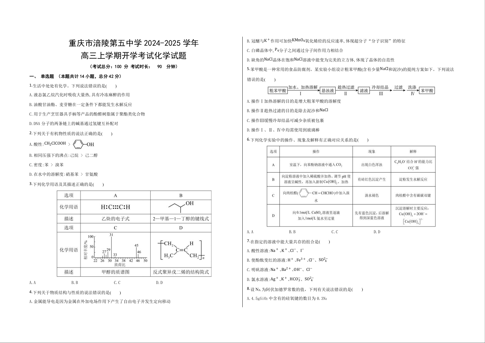 重庆市涪陵五中高2025届2024年上期开学考试 化学