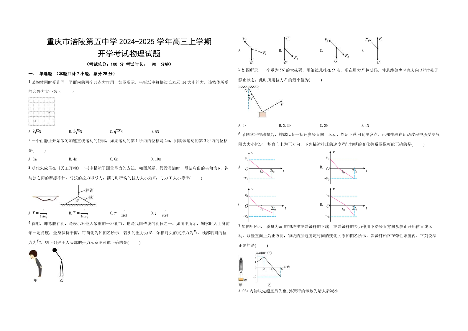 重庆市涪陵五中高2025届2024年上期开学考试 物理