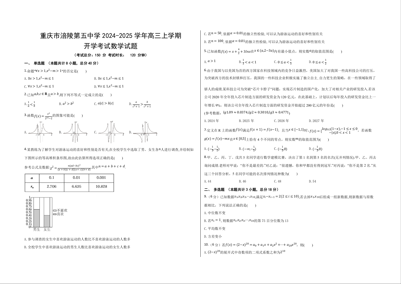 重庆市涪陵五中高2025届2024年上期开学考试 数学