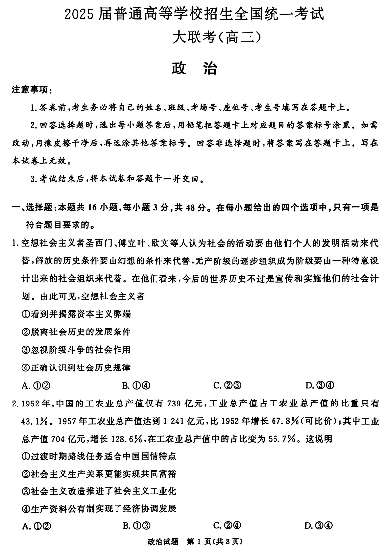 青桐鸣2025届高三10月大联考 政治