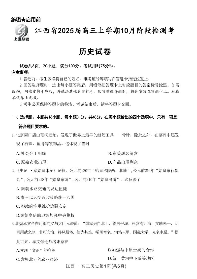 江西省稳派智慧上进联考2025届高三10月联考 历史
