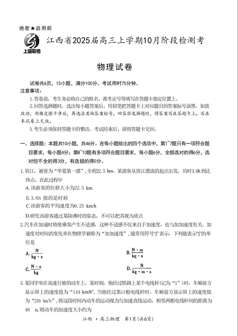 江西省稳派智慧上进联考2025届高三10月联考 物理