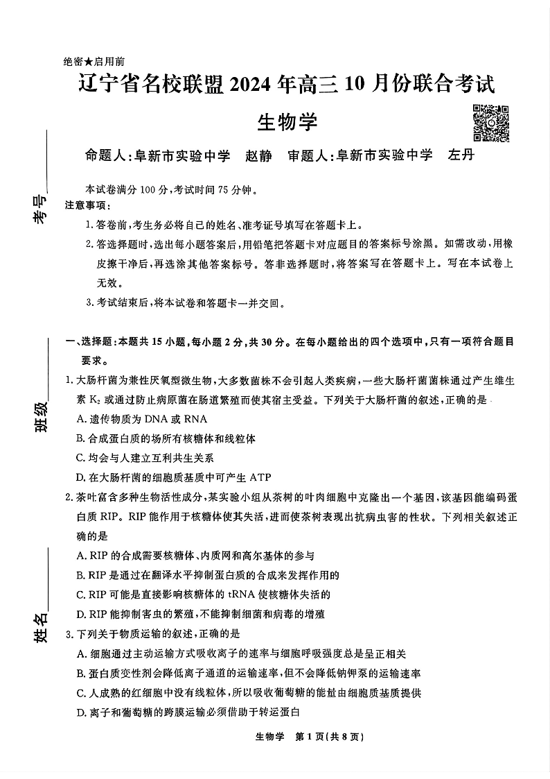 辽宁省名校联盟2024年高三10月份联合考试 生物