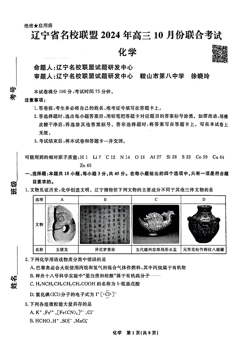 辽宁省名校联盟2024年高三10月份联合考试 化学