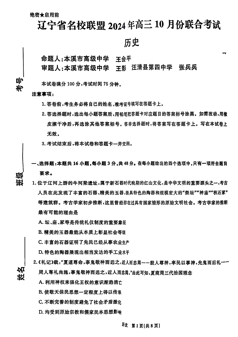 辽宁省名校联盟2024年高三10月份联合考试 历史