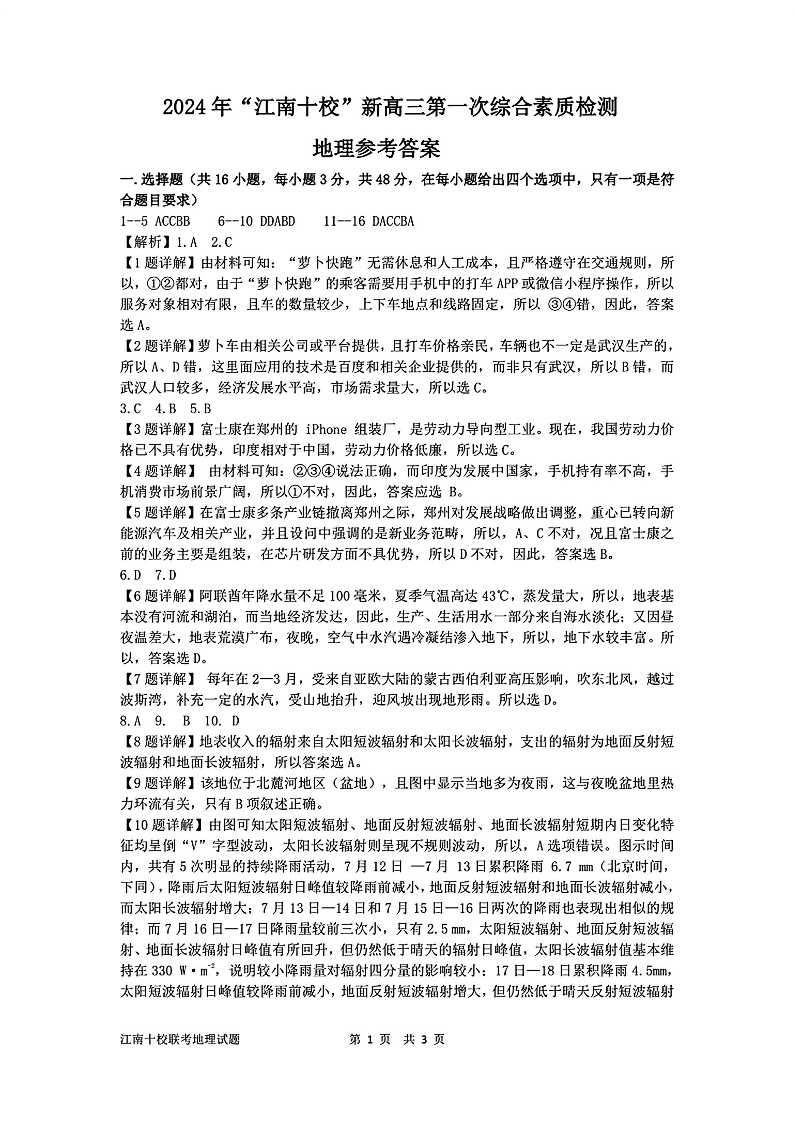 2024年“江南十校”新高三第一次综合素质检测 地理答案