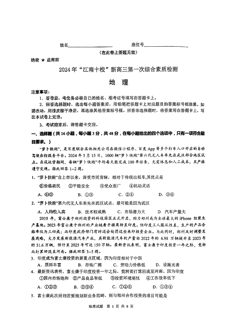 2024年“江南十校”新高三第一次综合素质检测 地理