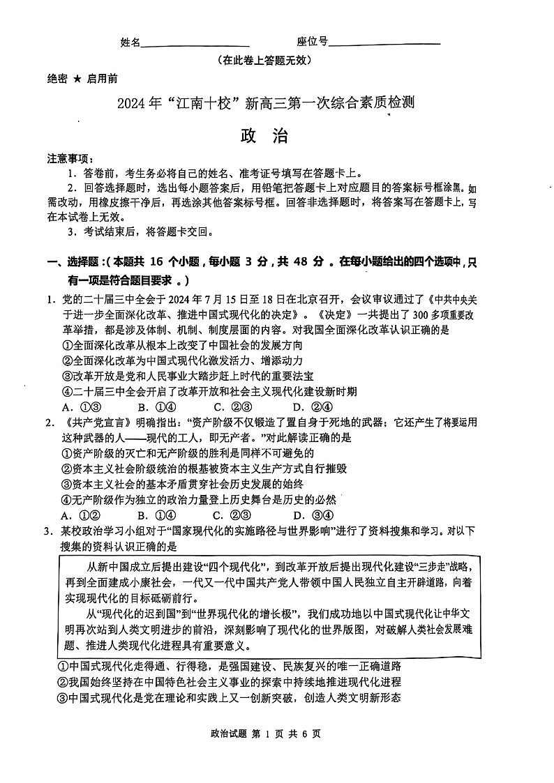 2024年“江南十校”新高三第一次综合素质检测 政治