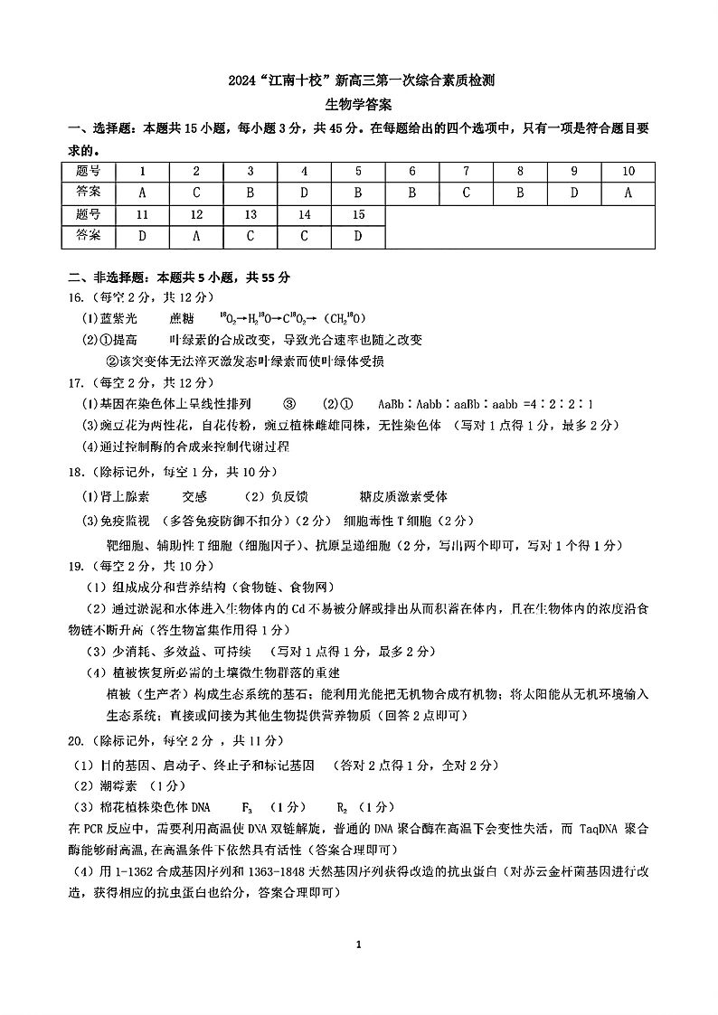 2024年“江南十校”新高三第一次综合素质检测 生物答案