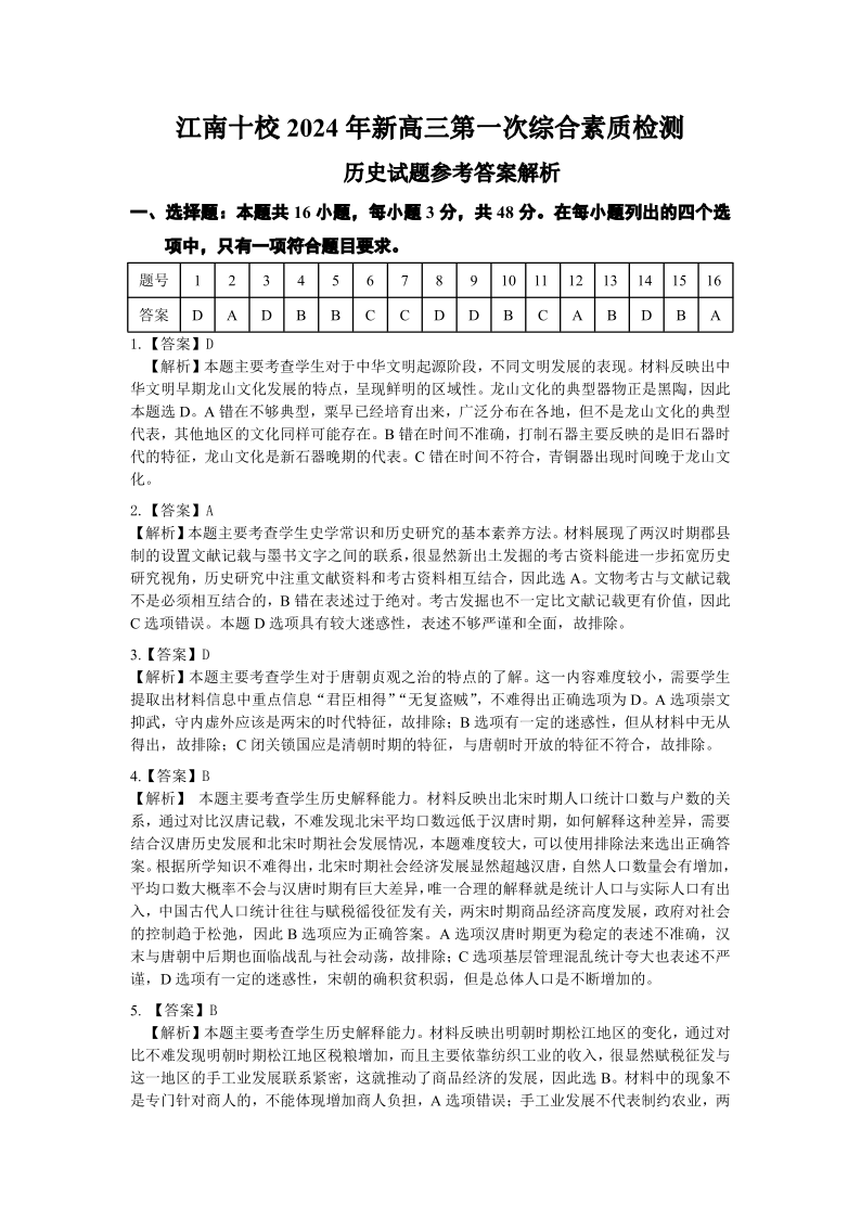 2024年“江南十校”新高三第一次综合素质检测 历史答案