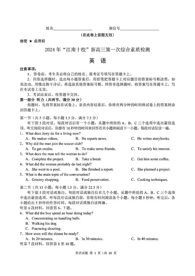 2024年“江南十校”新高三第一次综合素质检测 英语
