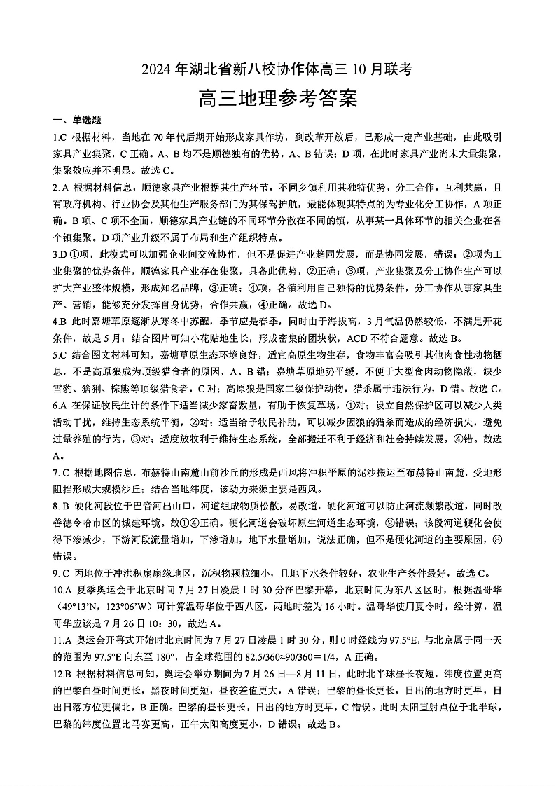 2024年湖北省新八校协作体高三10月联考 地理答案