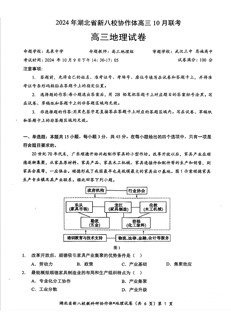 2024年湖北省新八校协作体高三10月联考 地理