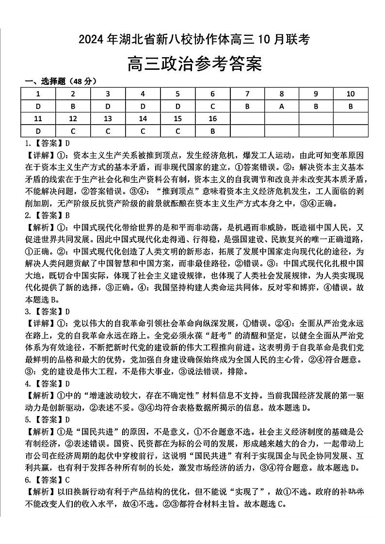 2024年湖北省新八校协作体高三10月联考 政治答案