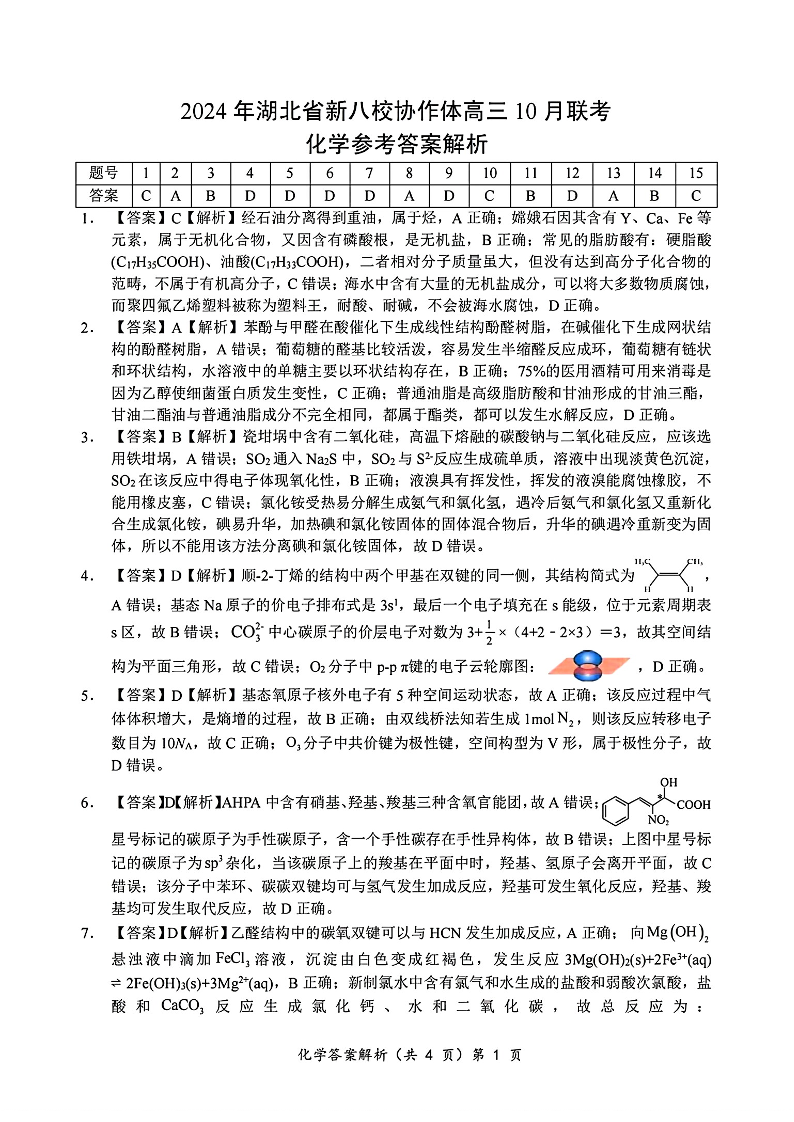 2024年湖北省新八校协作体高三10月联考 化学答案