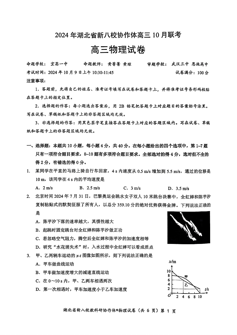 2024年湖北省新八校协作体高三10月联考 物理