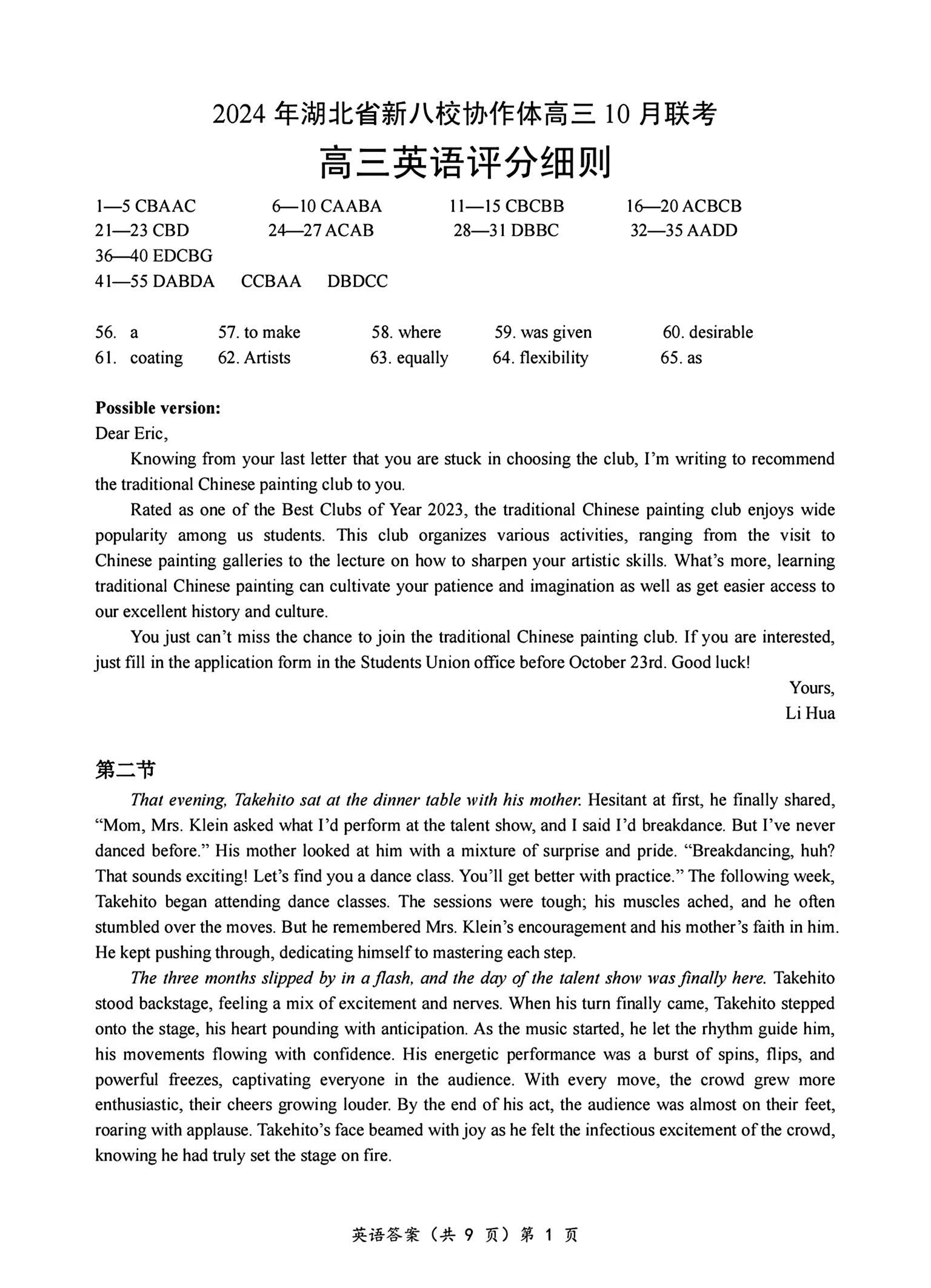 2024年湖北省新八校协作体高三10月联考 英语答案