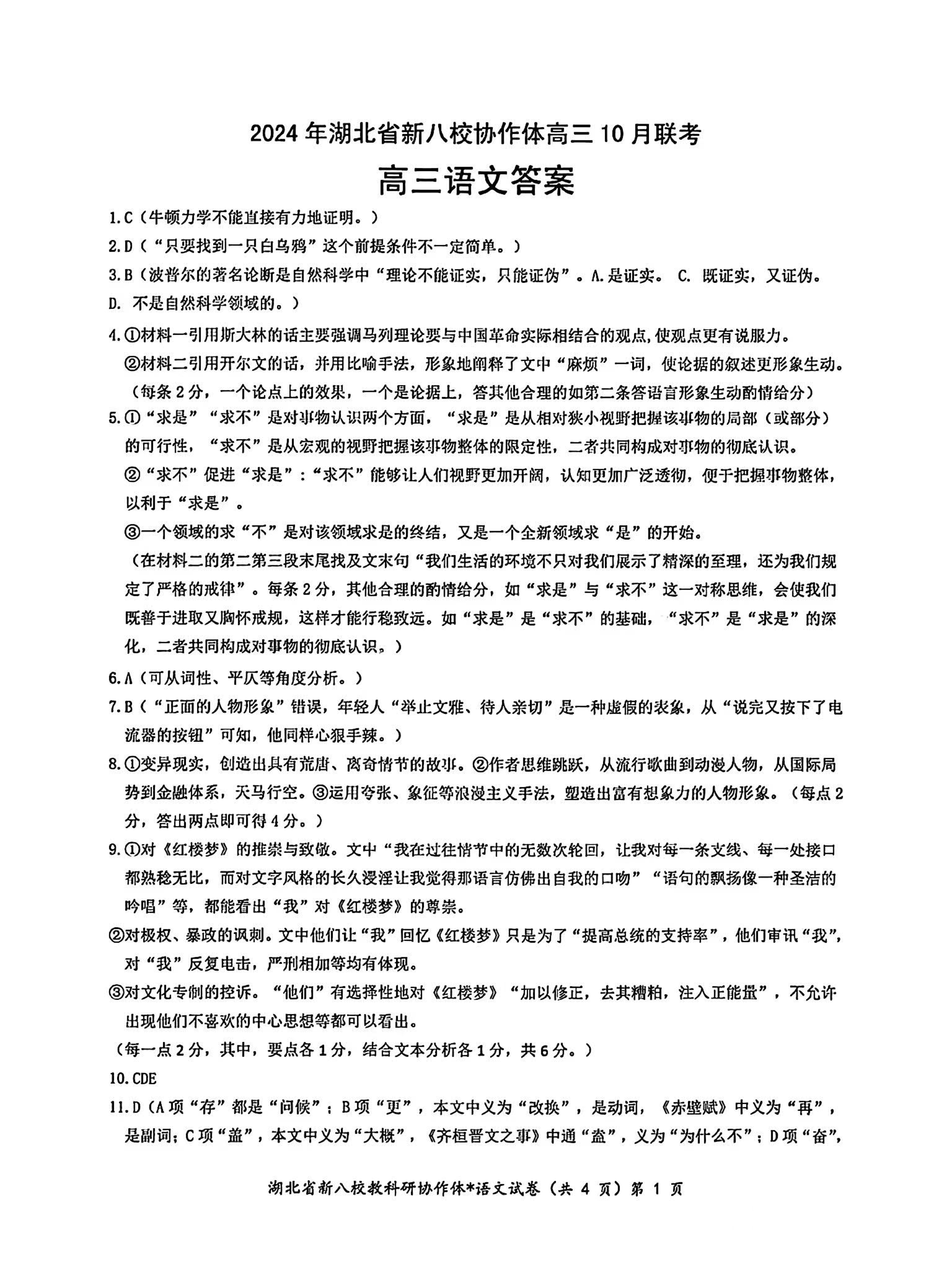 2024年湖北省新八校协作体高三10月联考 语文答案