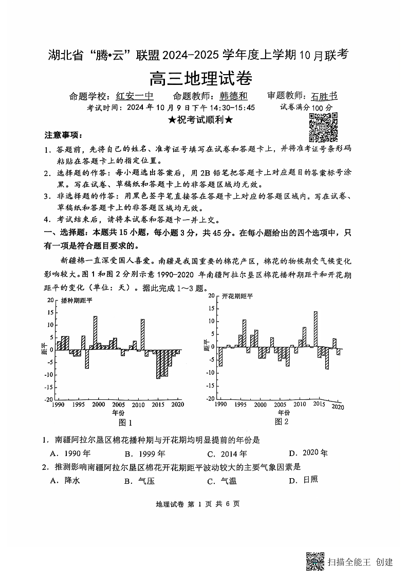 湖北省“腾•云”联盟2024-2025学年度上学期10月联考 地理