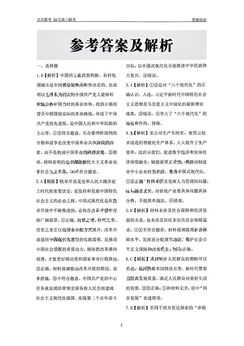 辽宁省点石联考2024-2025学年度上学期高三年级10月阶段考试 政治答案