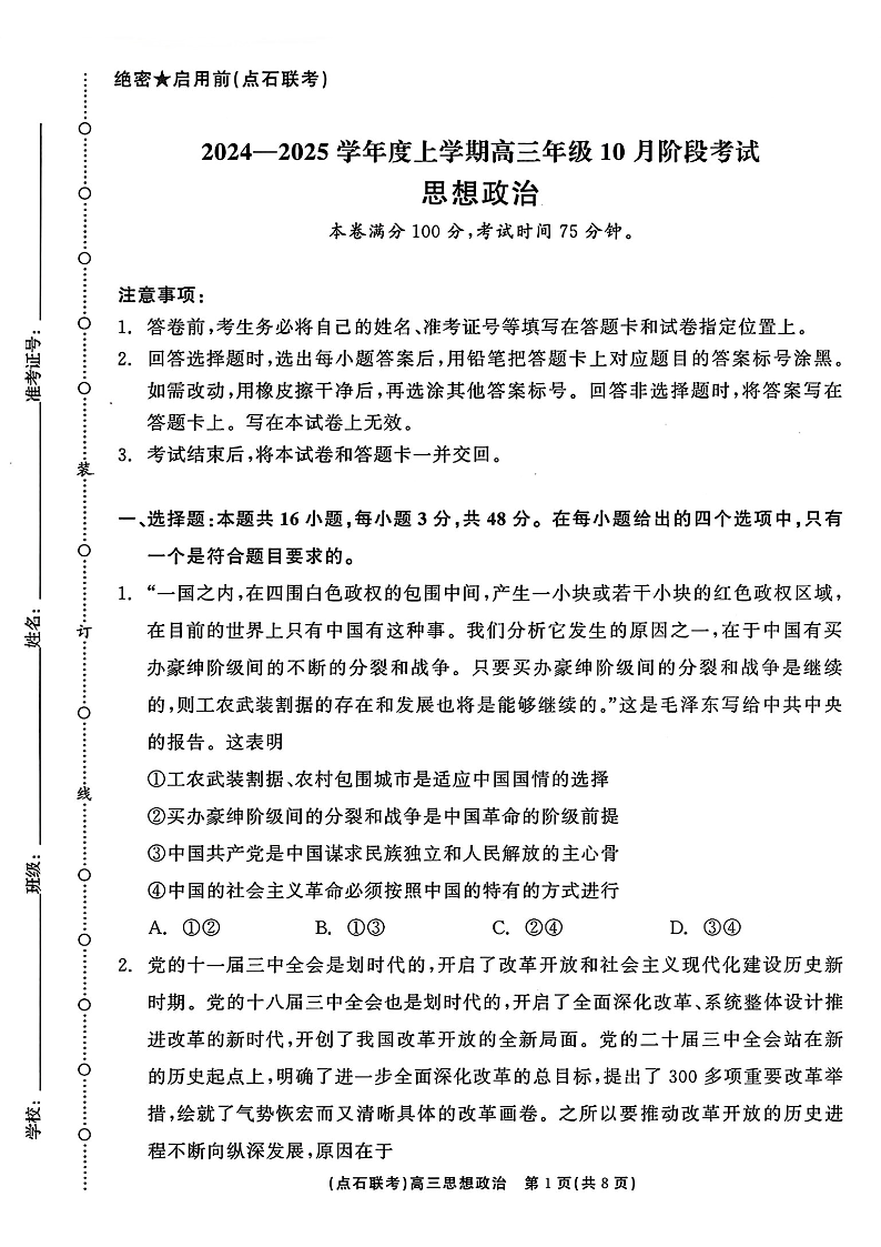 辽宁省点石联考2024-2025学年度上学期高三年级10月阶段考试 政治