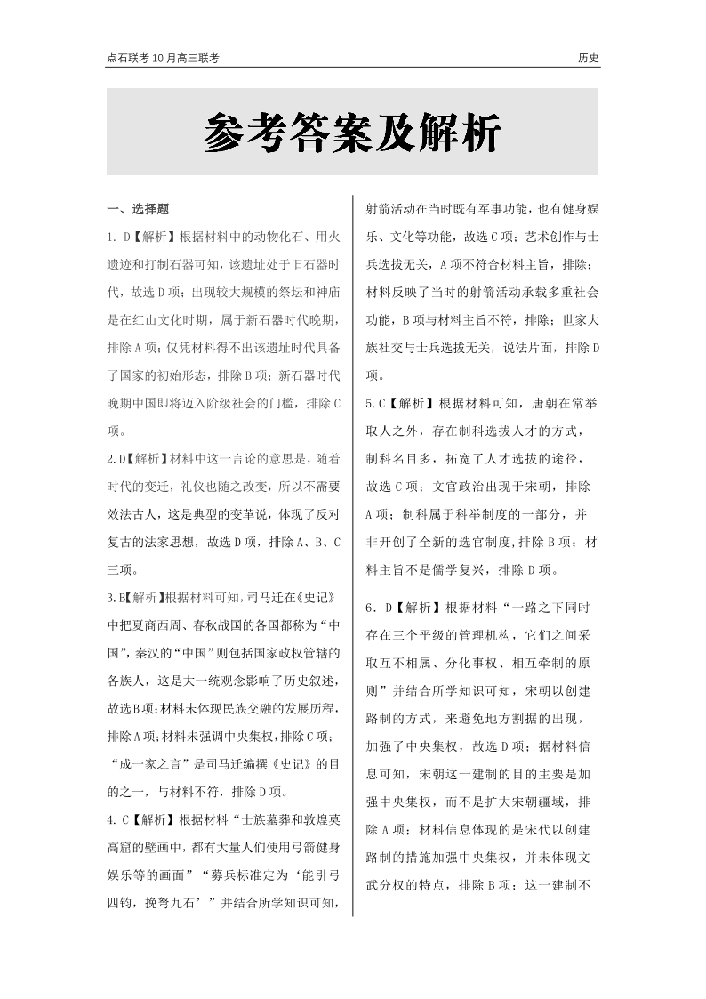 辽宁省点石联考2024-2025学年度上学期高三年级10月阶段考试 历史答案