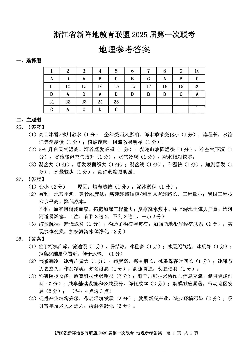 浙江省新阵地联盟2025届高三第一次联考 地理答案