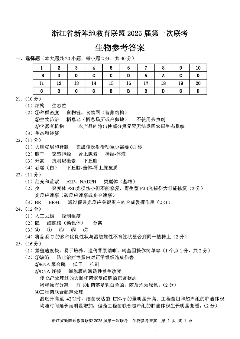 浙江省新阵地联盟2025届高三第一次联考 生物答案