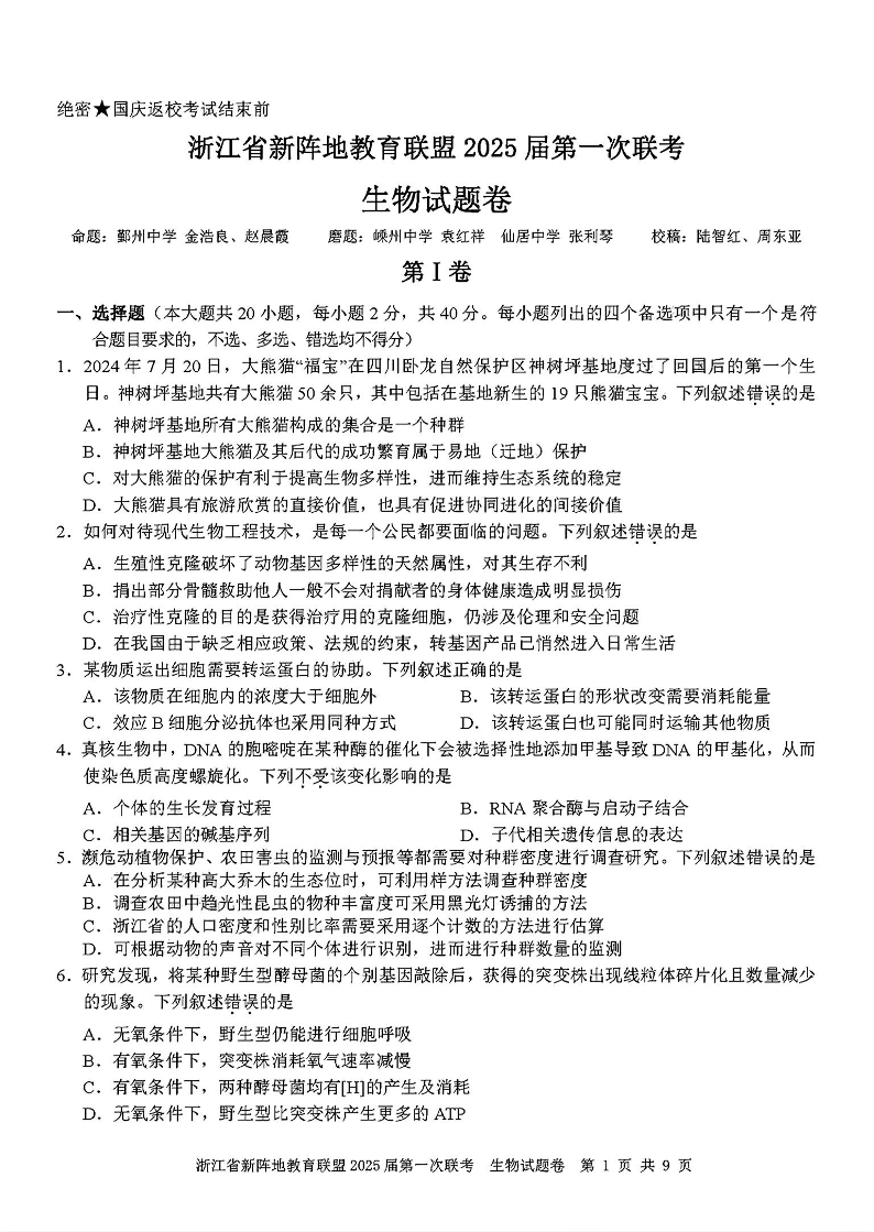 浙江省新阵地联盟2025届高三第一次联考 生物