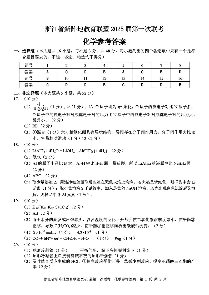 浙江省新阵地联盟2025届高三第一次联考 化学答案