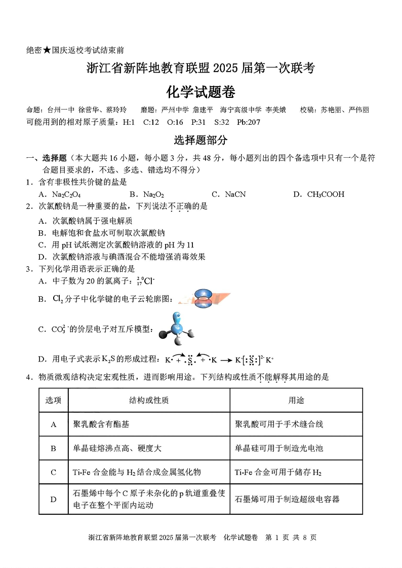 浙江省新阵地联盟2025届高三第一次联考 化学